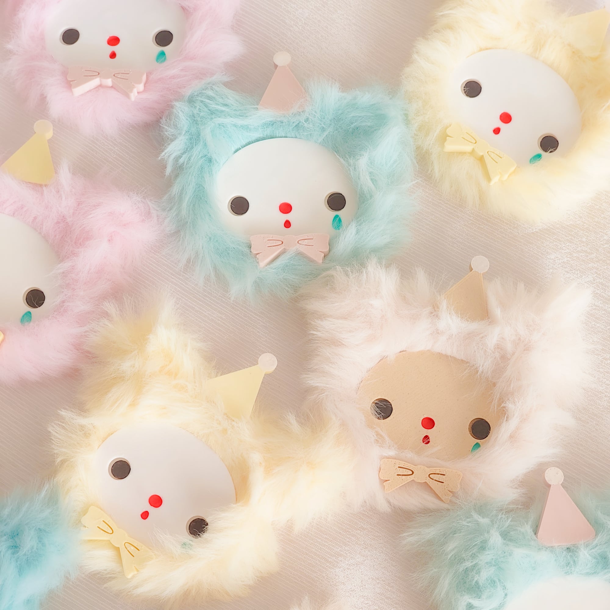 カラフルタイプはお顔がホワイト、ベージュはお顔と帽子、リボンもベージュです。